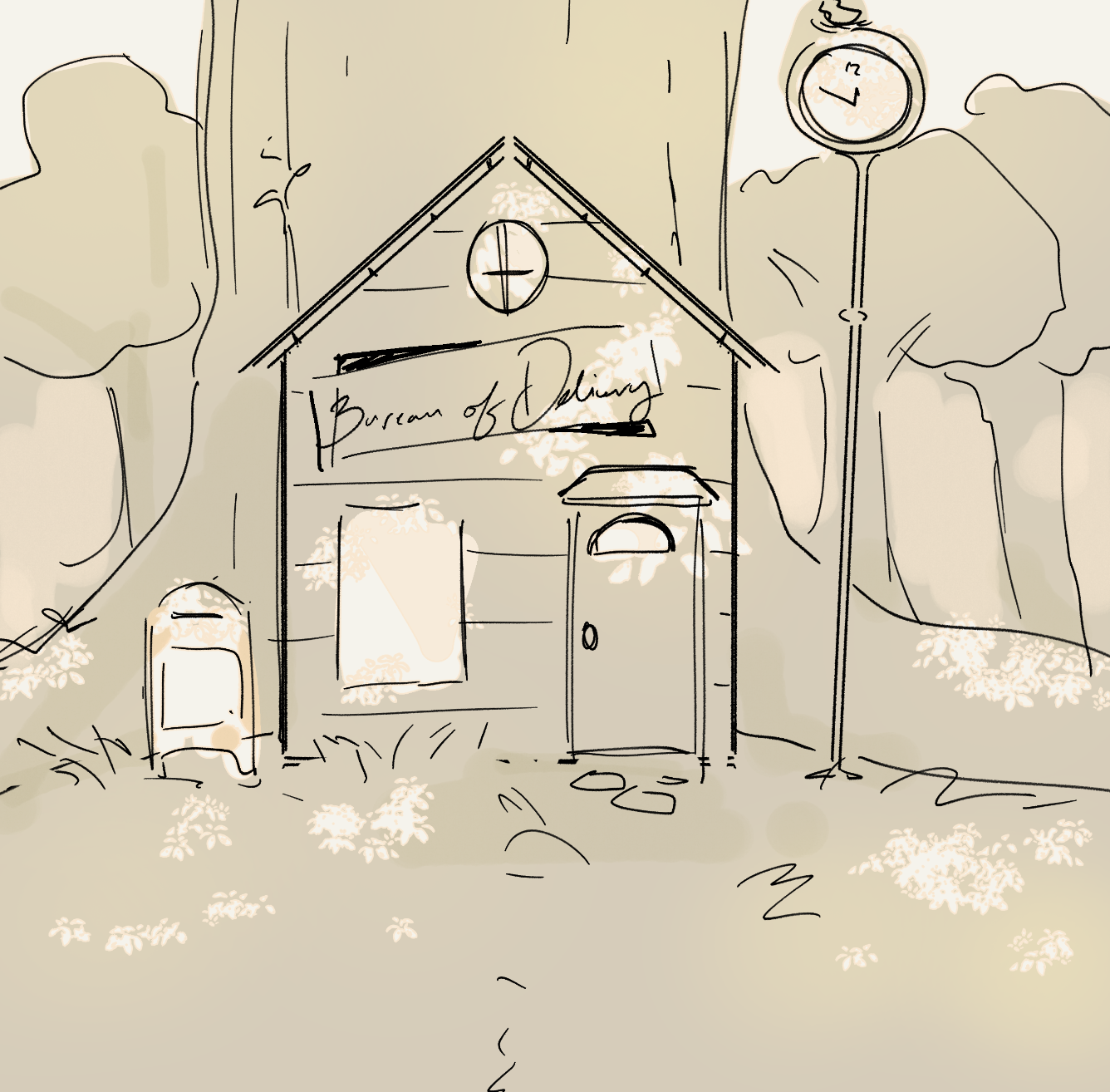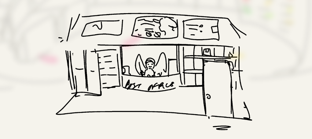 The planning for Rain started with me telling theo that I would love to make a story in a fantasy post office, inspired by a music video we had watched set in an old, rustic looking post. That was nearly the extent of the initial pitch… past that, I originally suggested that the couriers would be fairies! Thankfully, theo mentioned that a post office reminded them of carrier pigeons and instead brought up the idea that our postal workers could instead be based on birds.