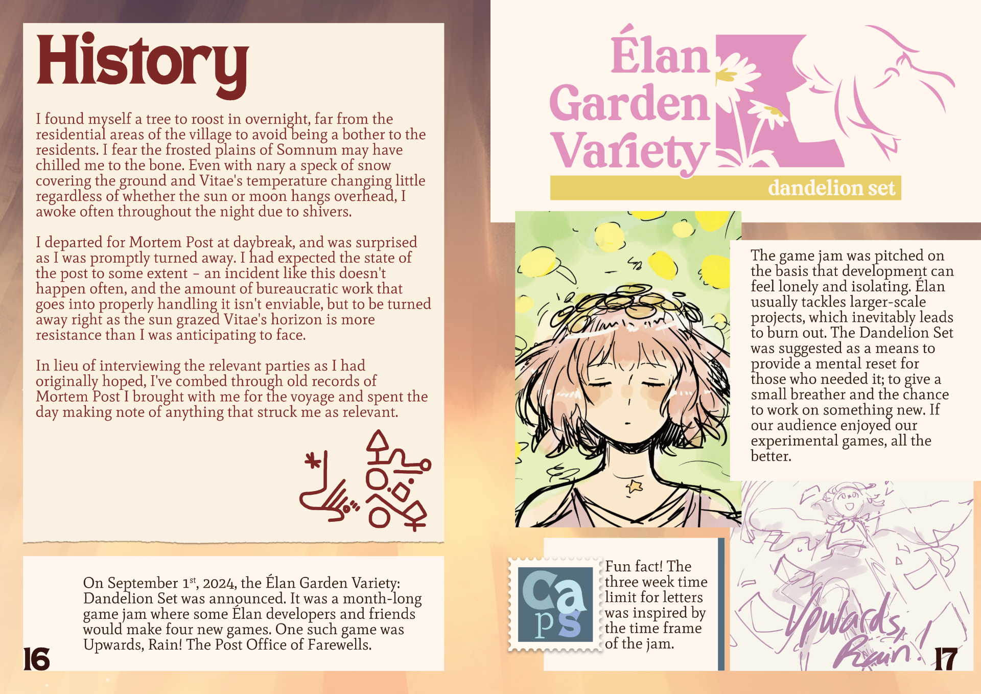 The journal was something that existed in Twofold and it was easy to adapt, but what if Rain created a new character from scratch? That'd be a fun angle to explore, and that simple narrative may be enough of a hook to get people on board with a later-than-usual artbook! I pitched the idea to Theo and we brainstormed back and forth about the logistics of it. How much of it would be in-character, what would the character be like, etc. Ultimately we decided on a sort of storykeeper – an outsider whose job was to document an event. That was the initial pitch and where things were kept as we planned out the book together, but we came to a horrifying realization not too long after.
